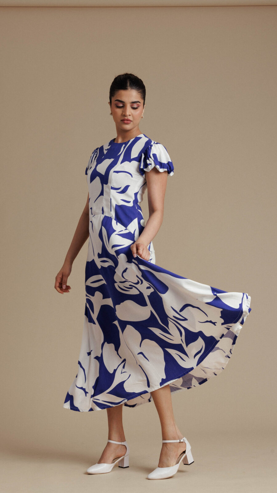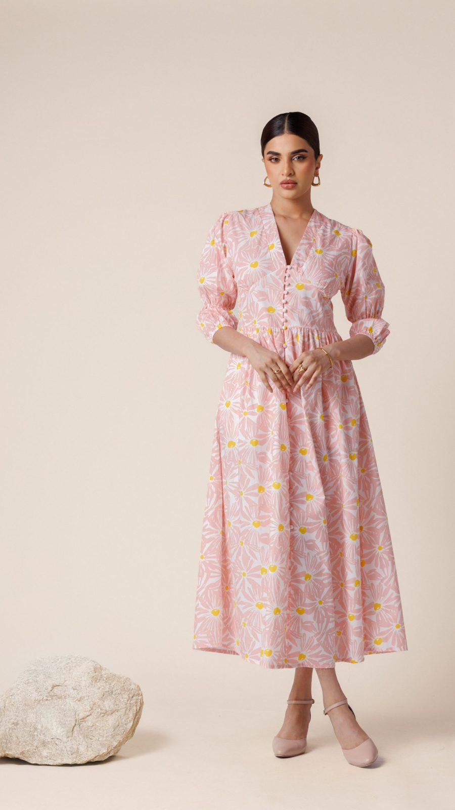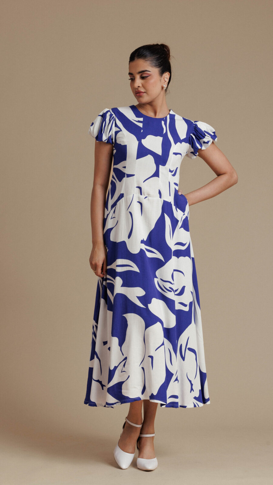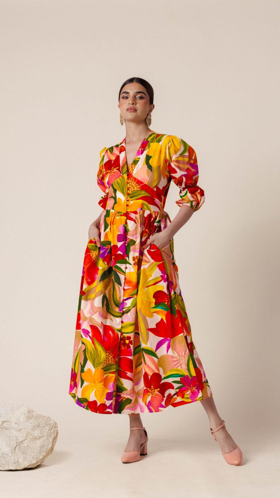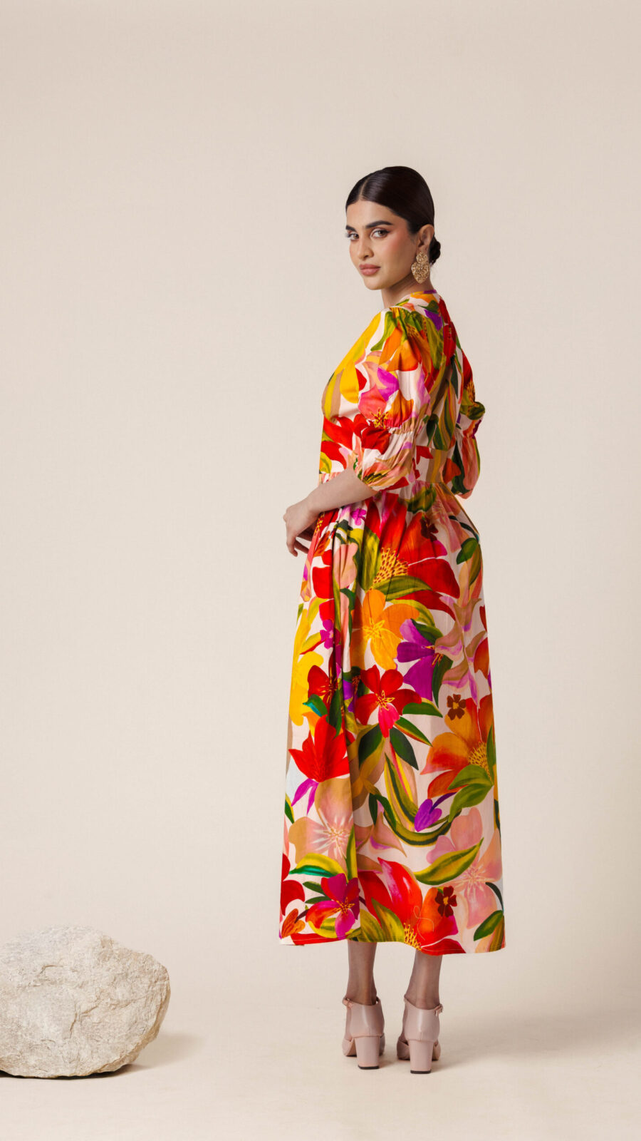 V-Neck Lantern Sleeve Floral Cotton Maxi Dress