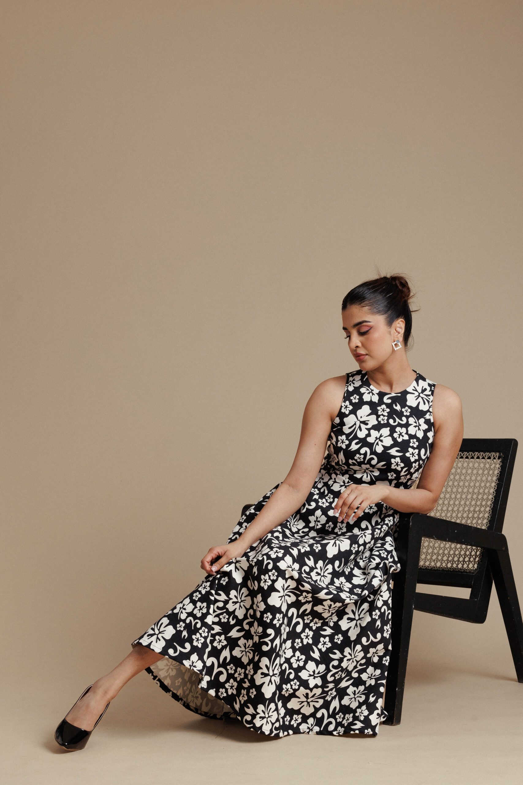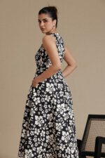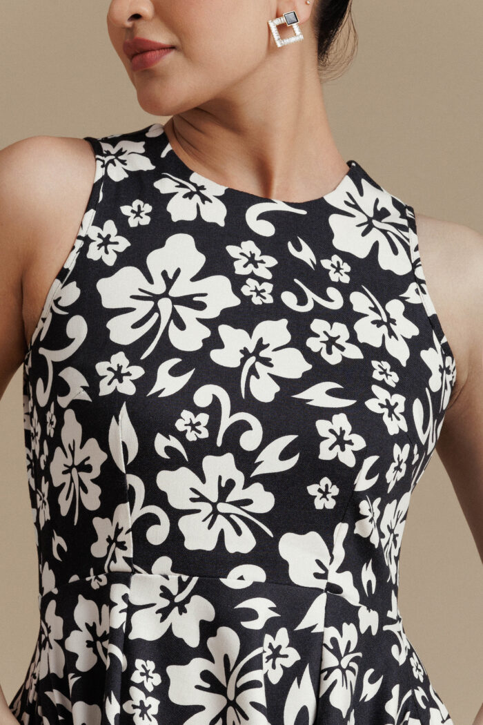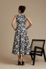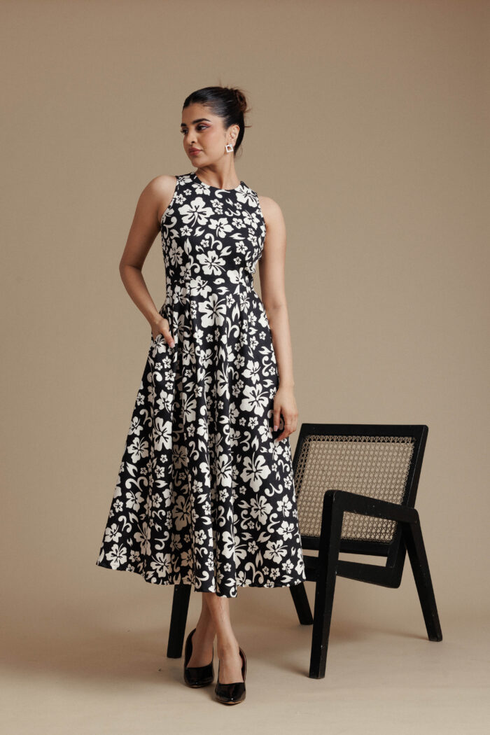 Be the first to review “Black & White Floral Sleeveless Flared Midi Dress”