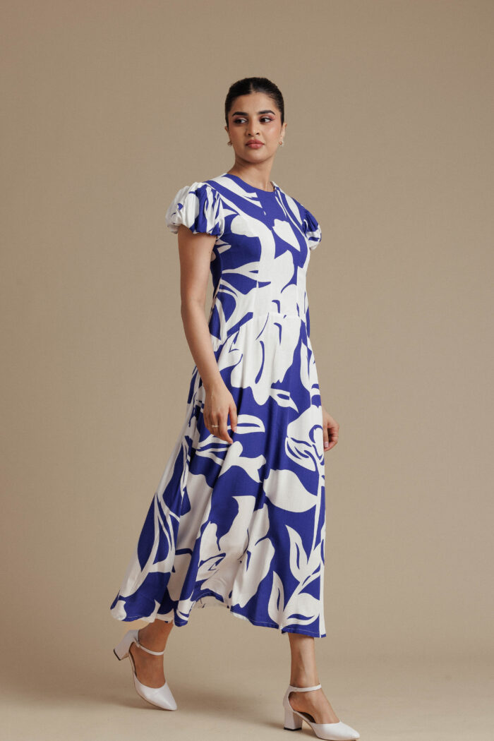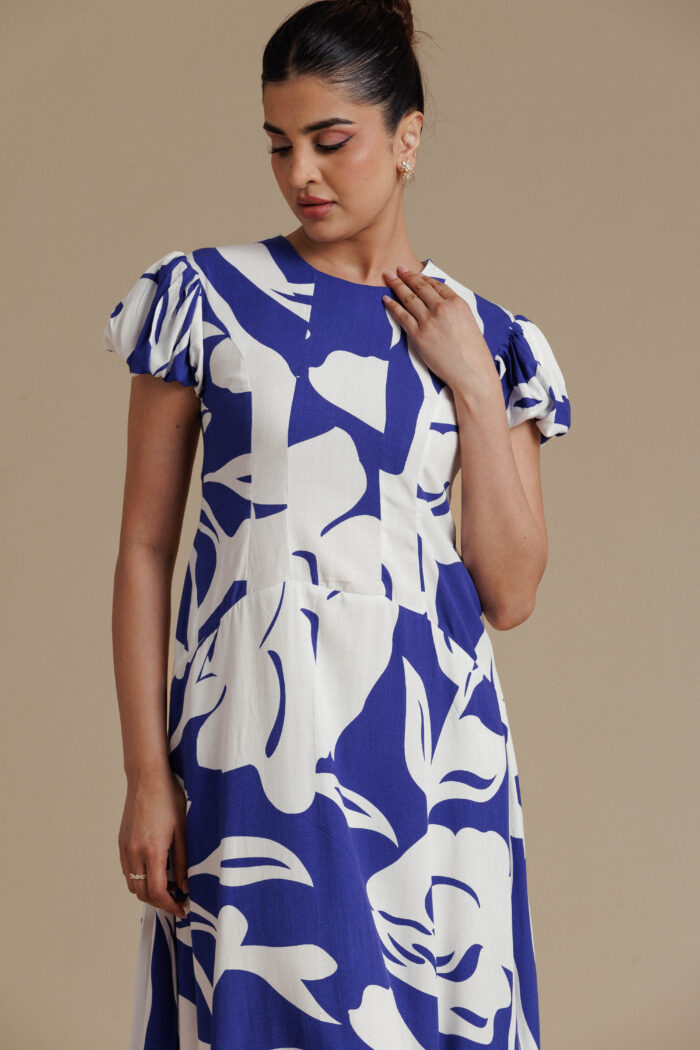 Fresh and striking, this blue and white floral midi dress features a contoured bodice with a clean round neckline and softly structured puff sleeves for a graceful, feminine silhouette. The fitted waist flows into a fluid flared skirt that creates effortless movement, while discreet side pockets add everyday practicality. With its bold floral print and elegant structure, this piece brings modern charm to refined daytime dressing.