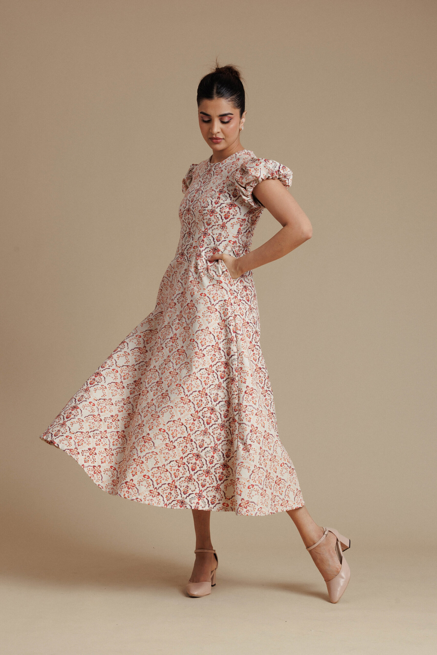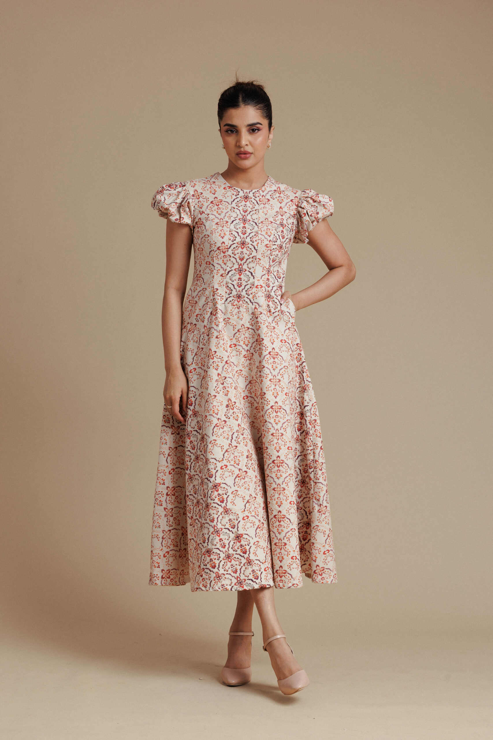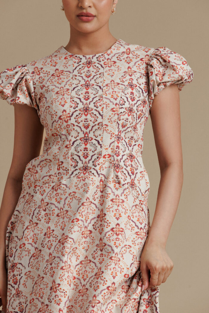 Warm and elegant, this beige and red floral midi dress features a contoured bodice with a clean round neckline and softly structured puff sleeves for a graceful, feminine silhouette. The fitted waist flows into a full flared skirt that creates beautiful volume and movement, while discreet side pockets add everyday practicality. With its rich floral pattern and refined structure, this piece brings effortless sophistication to daytime dressing.