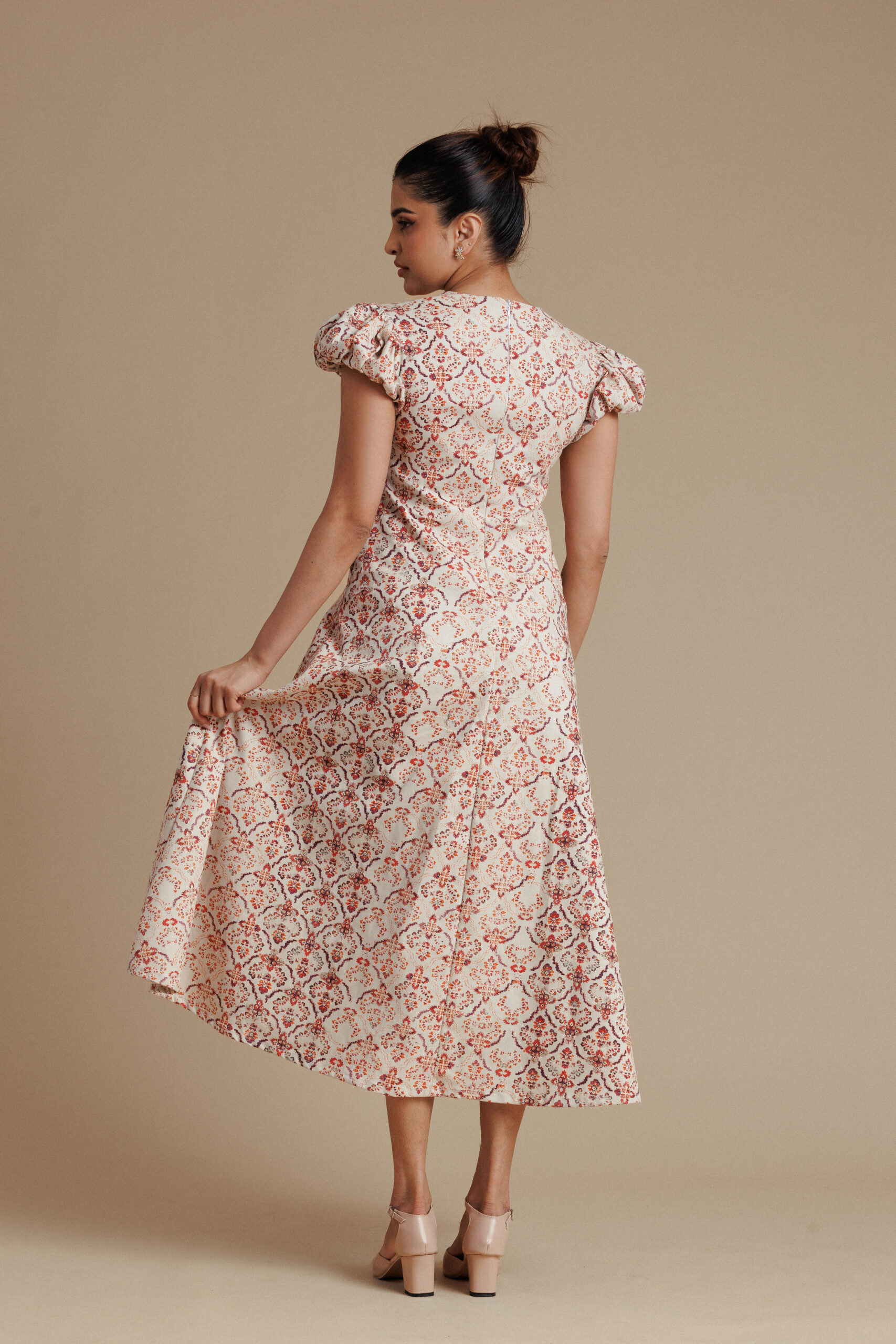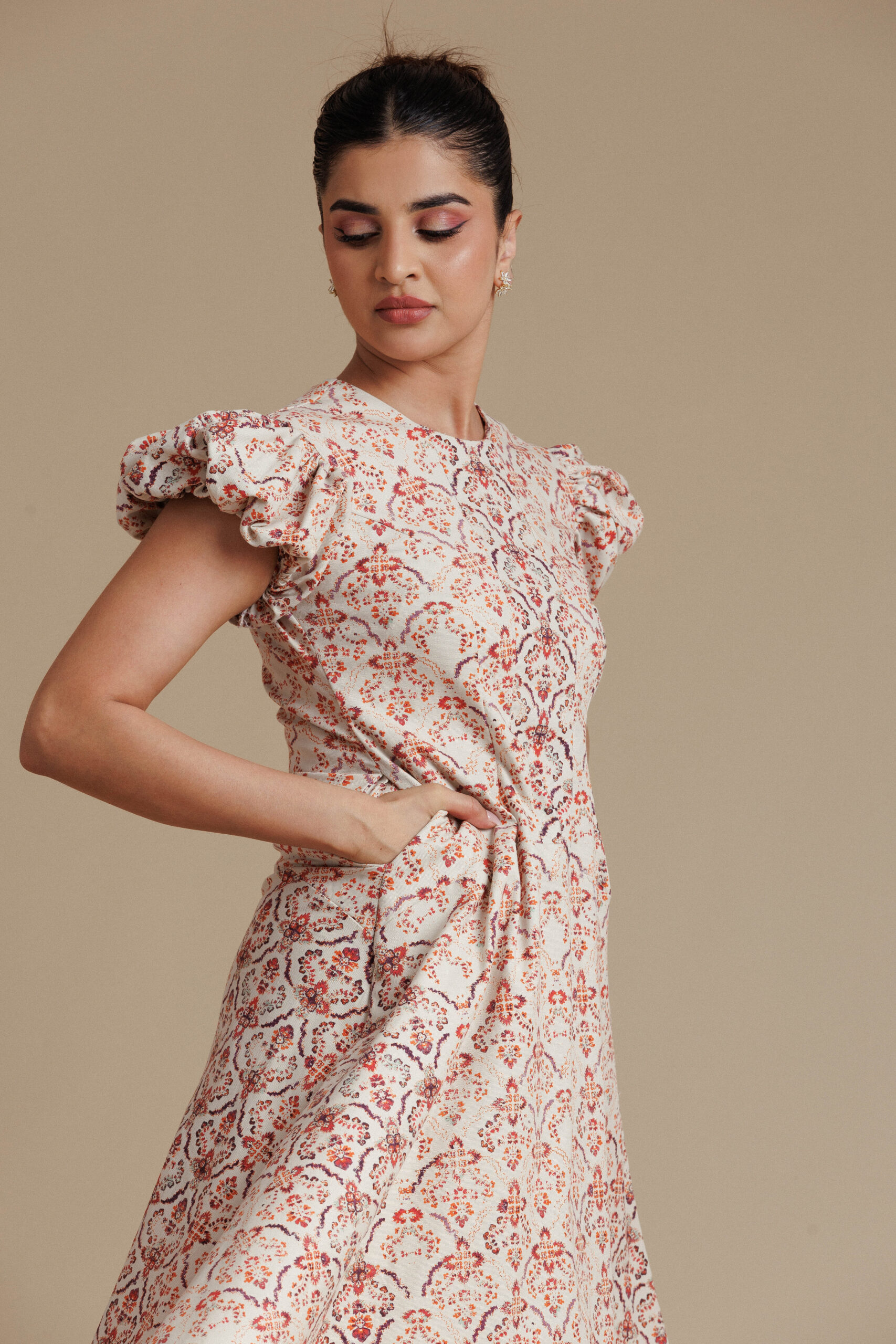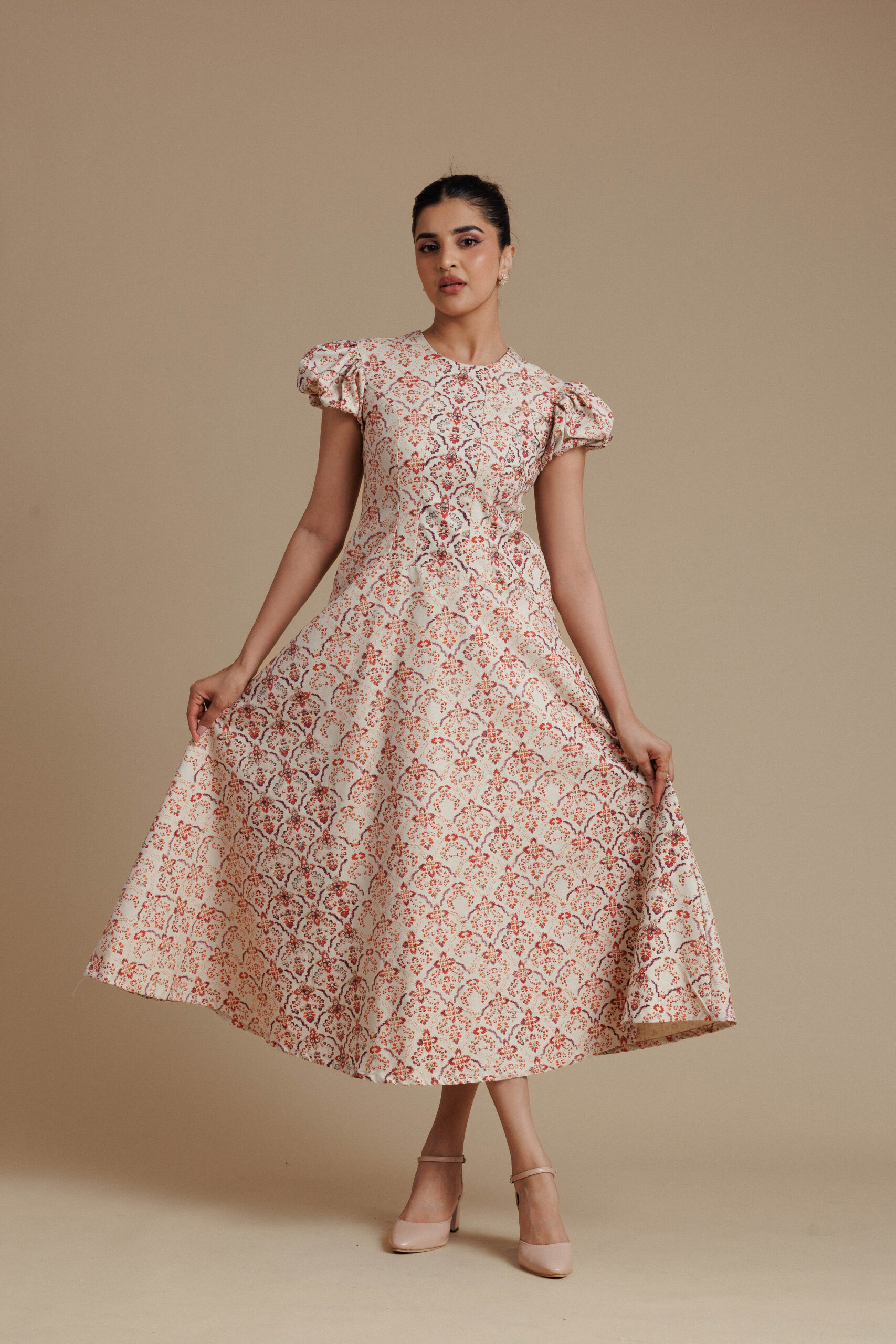 Warm and elegant, this beige and red floral midi dress features a contoured bodice with a clean round neckline and softly structured puff sleeves for a graceful, feminine silhouette. The fitted waist flows into a full flared skirt that creates beautiful volume and movement, while discreet side pockets add everyday practicality. With its rich floral pattern and refined structure, this piece brings effortless sophistication to daytime dressing.