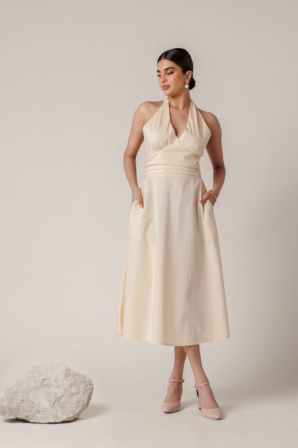 LKR 5,450.00 SKU: WTD05-RDV-Neck Lantern Sleeve Golden Beige Maxi Dress