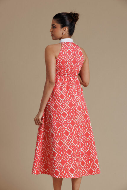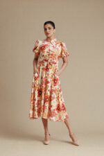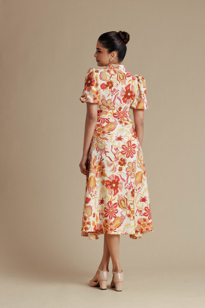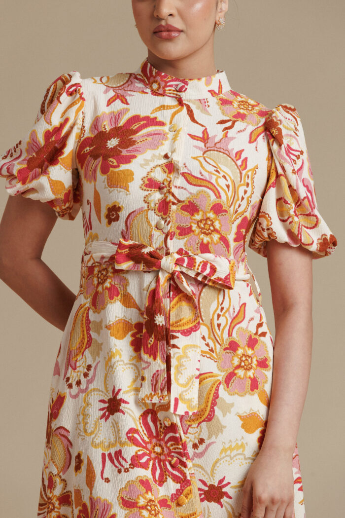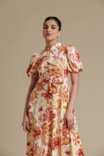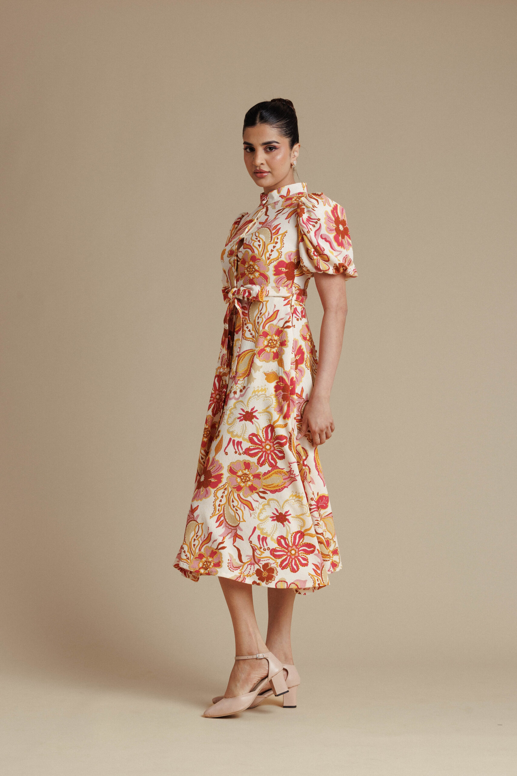 Graceful and radiant, the Aurelia Bloom Midi Dress is crafted in richly textured floral cotton that captures warmth and timeless femininity. Designed with a structured high neckline, softly puffed sleeves, and a flattering waist tie that defines the silhouette, it flows into a beautifully flared skirt for effortless movement. Finished with delicate front buttons and discreet side pockets, this piece blends refined elegance with everyday comfort, perfect for polished daytime outings and special moments alike.