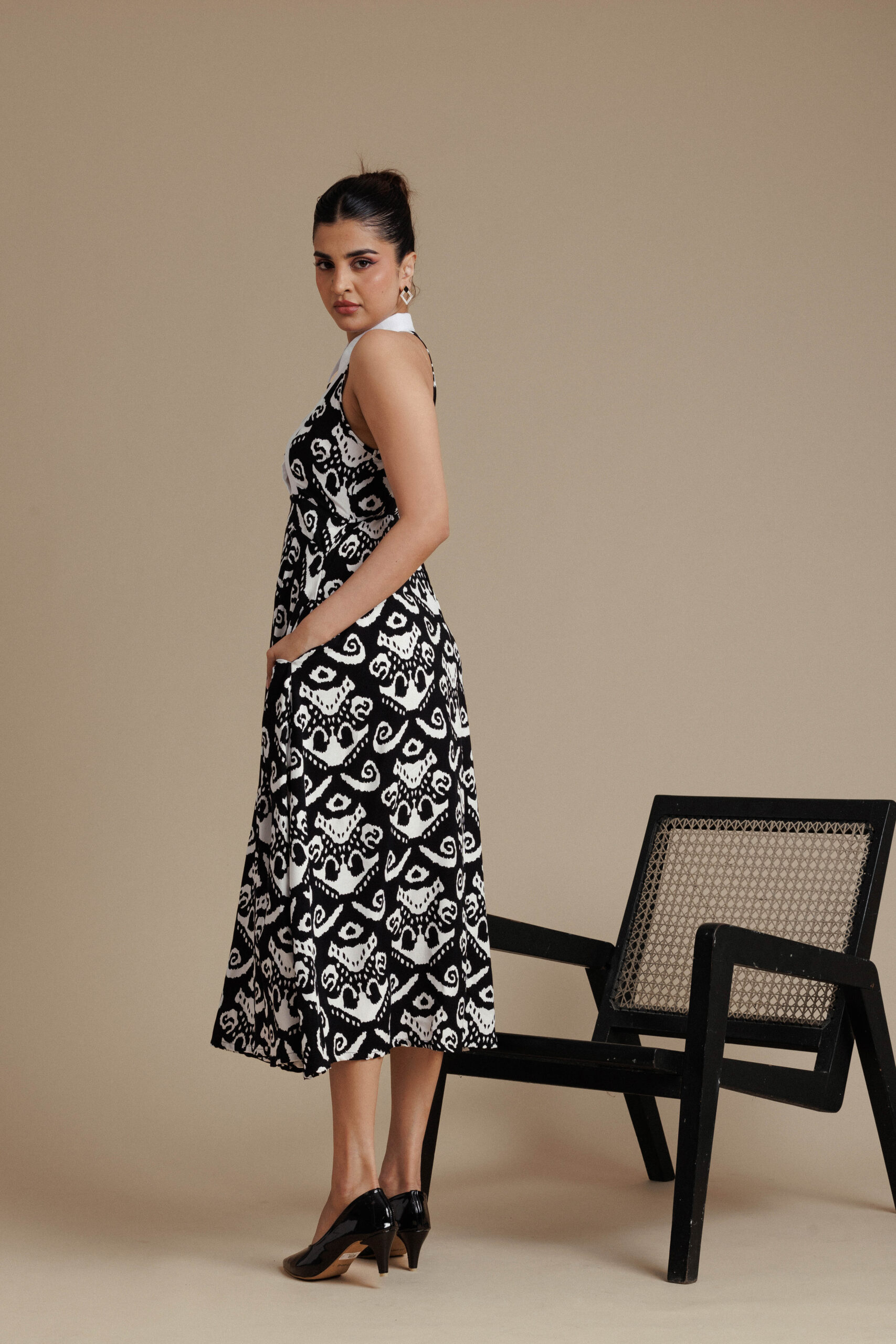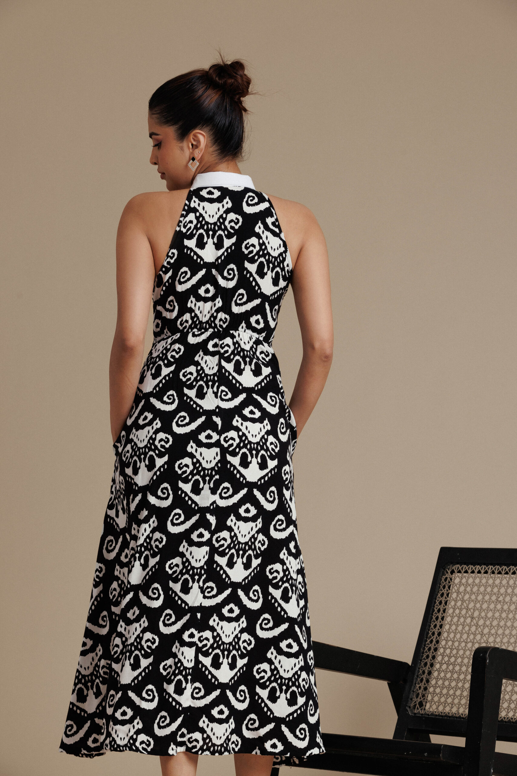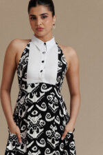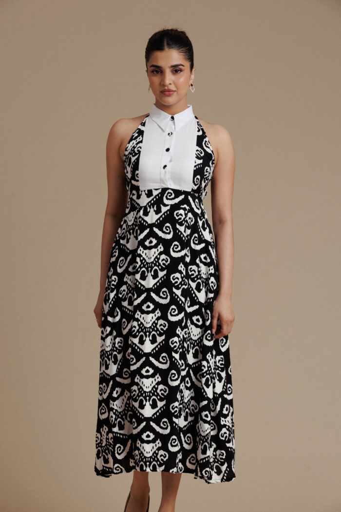 Bold and sophisticated, this printed black and white ikat midi dress features a structured halter-style bodice with a crisp white collar and refined front button detailing. The fitted waist flows into a softly flared skirt that creates elegant movement, while discreet side pockets add everyday practicality. With its striking monochrome pattern and clean tailoring, this piece blends modern confidence with timeless elegance.