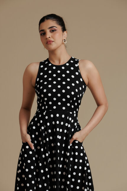 Black Polka Dot Sleeveless Flared Midi Dress