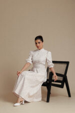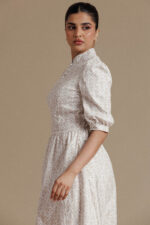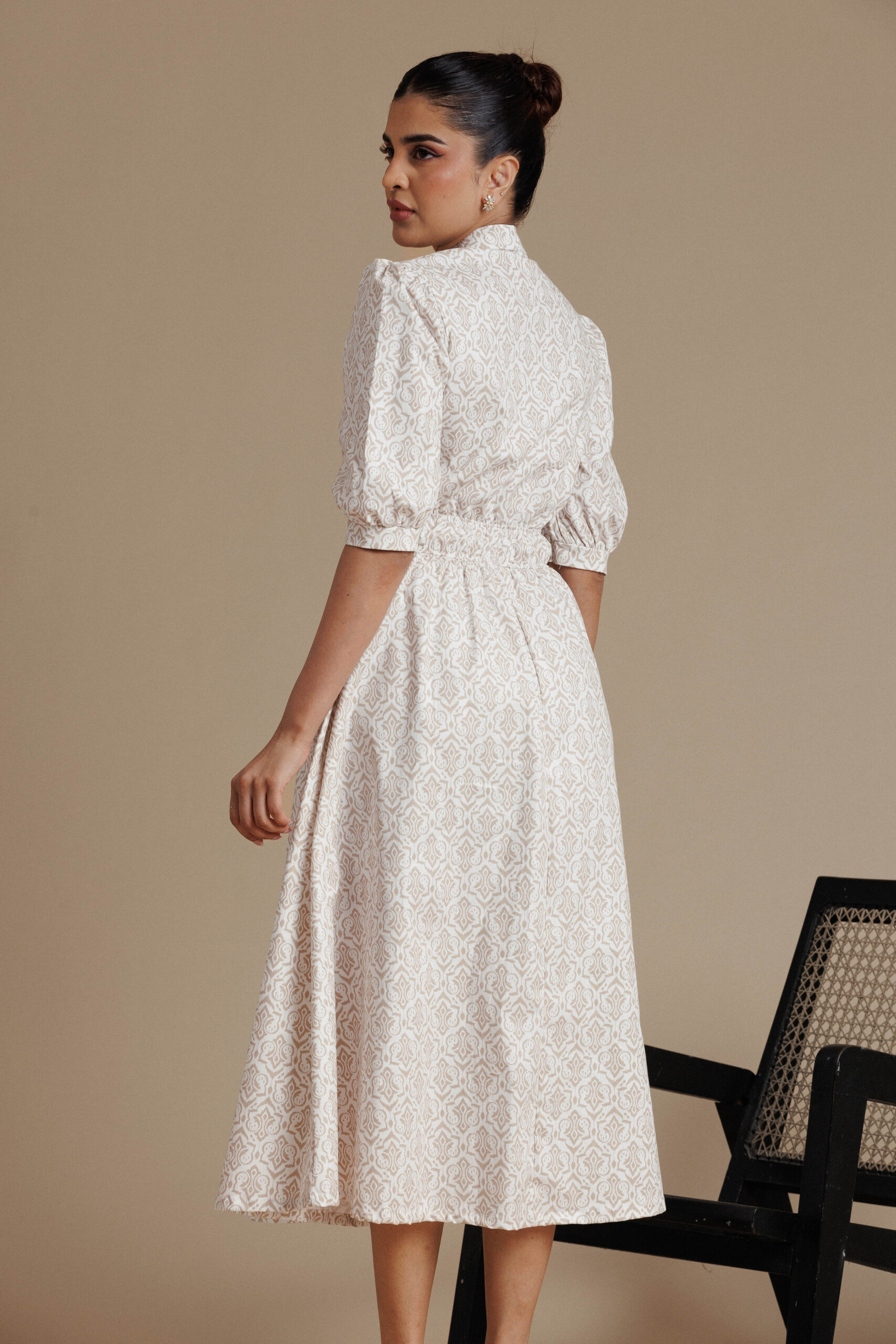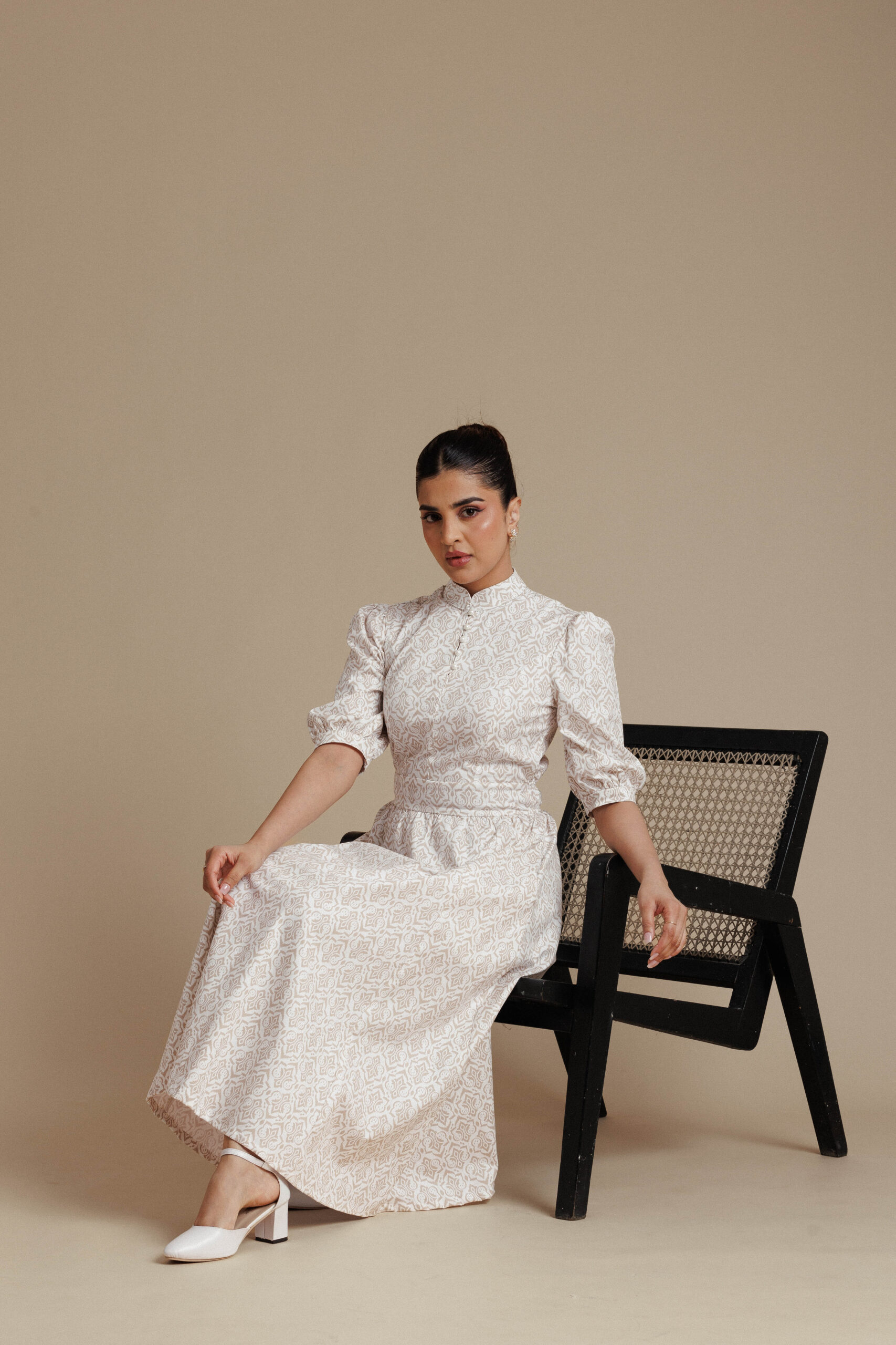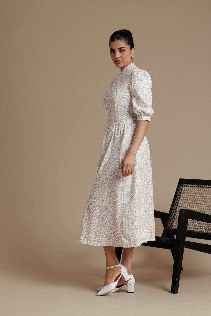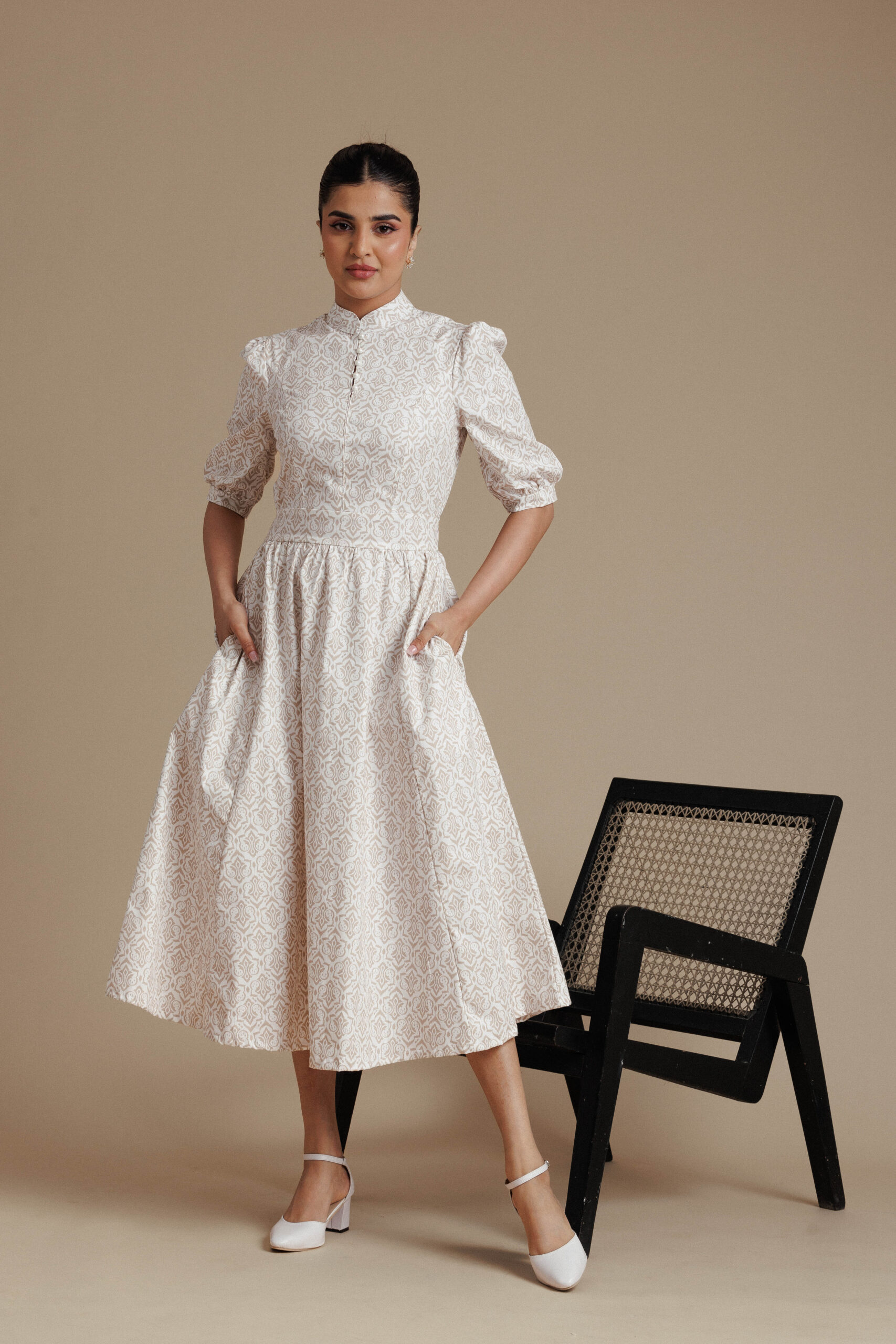 Elegant and refined, this ivory and gold midi dress features a high neckline with delicate front button detailing and softly structured puff sleeves for a graceful, feminine silhouette. The fitted bodice flows into a gently flared skirt that offers effortless movement, while discreet side pockets add everyday practicality. With its subtle gold pattern and timeless shape, this piece embodies understated luxury.