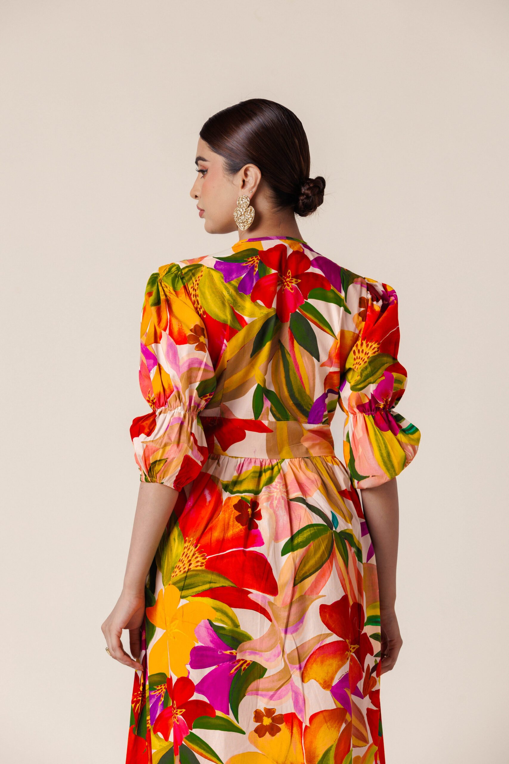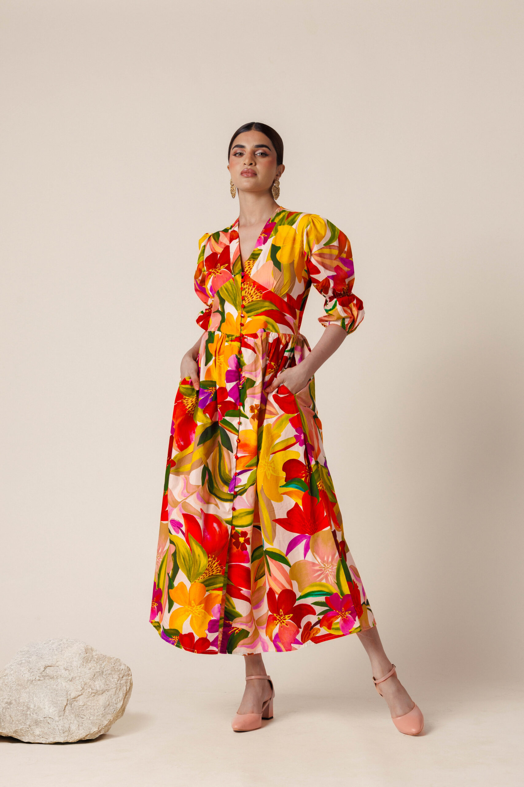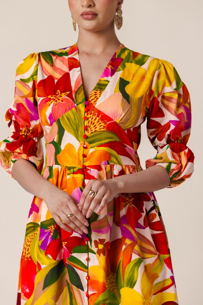 Showcasing bold elegance, this V-Neck Lantern Sleeve Cotton Maxi Dress features vibrant floral prints, a knee-length button-down front, and breathable cotton fabric that flows with ease. Designed with two side pockets, it’s your go-to for graceful spring and summer moments.