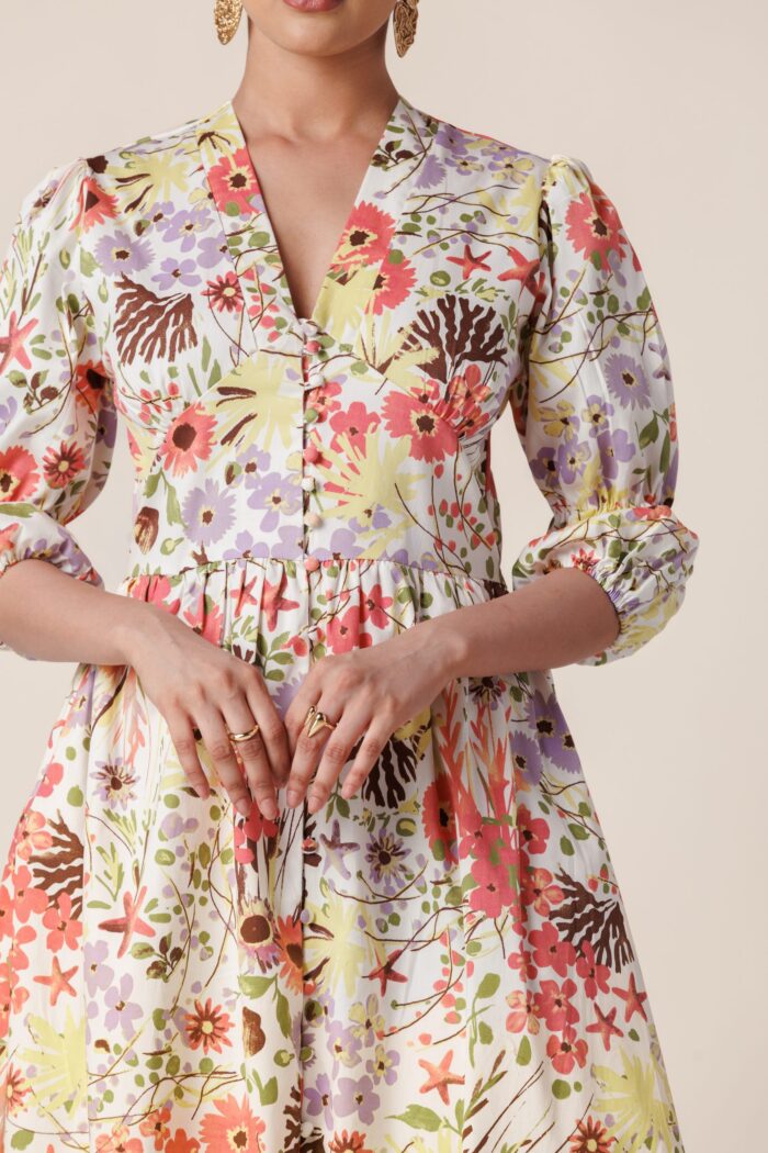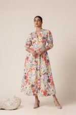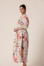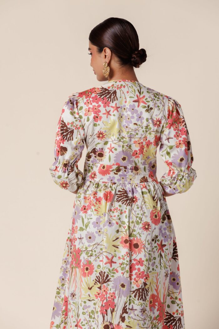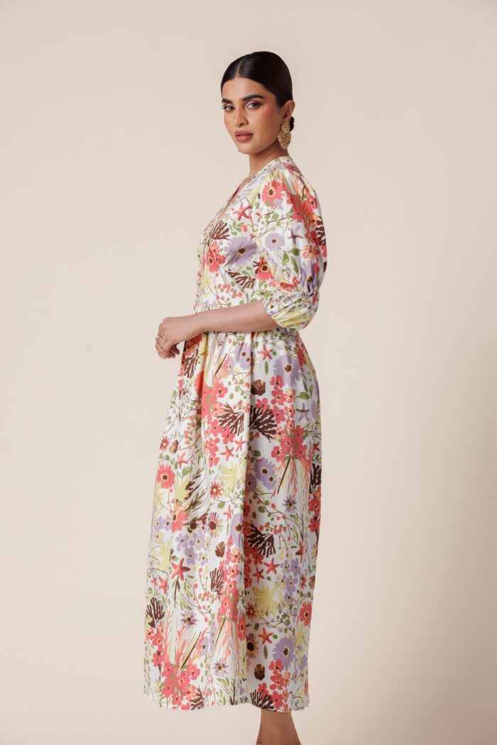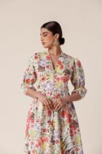 Radiating soft elegance, this V-Neck Lantern Sleeve Cotton Maxi Dress features delicate multicolor floral prints on a crisp white base. With a partial button-down front, breathable premium cotton, and practical side pockets, it’s a graceful choice for relaxed spring and summer days.