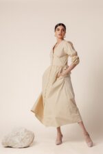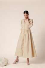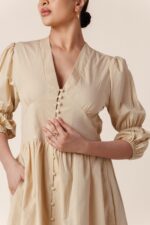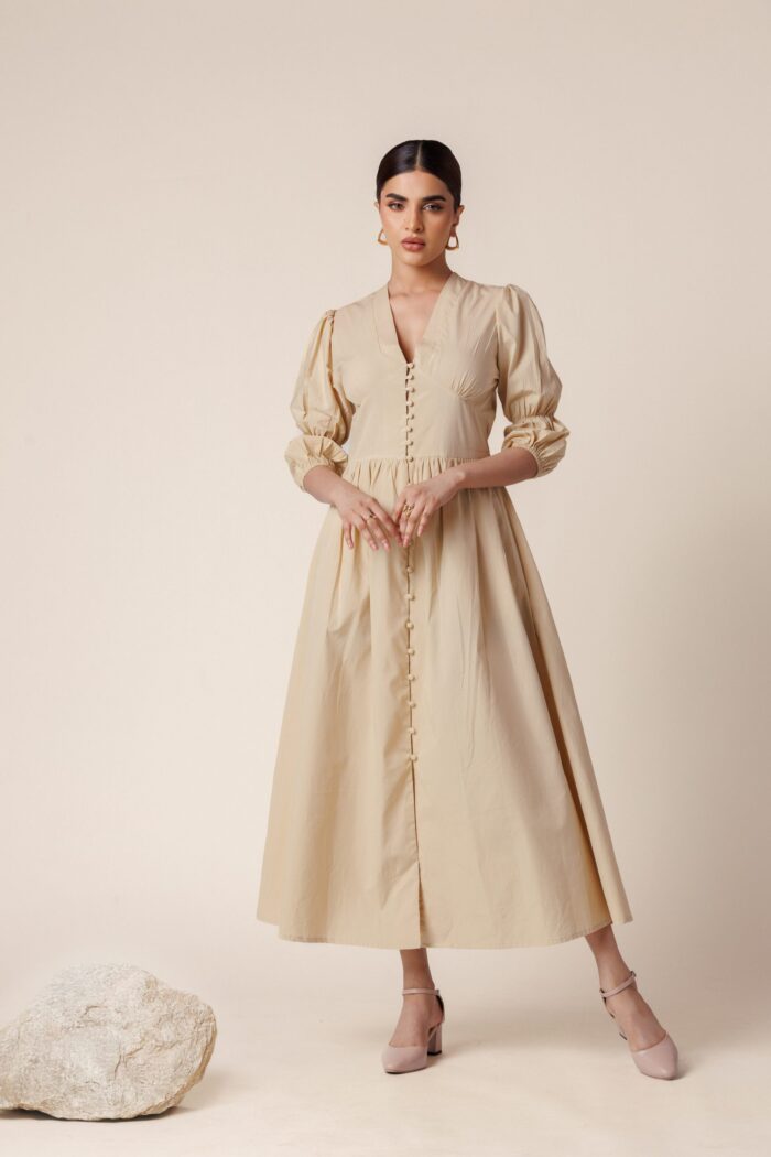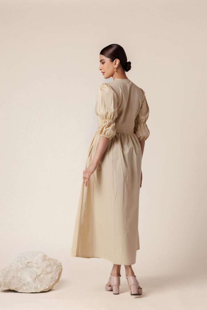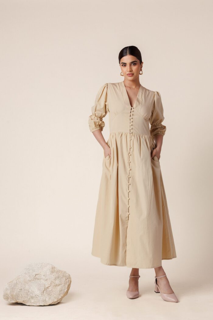 Timeless and graceful, this V-Neck Lantern Sleeve Cotton Maxi Dress in Golden Beige radiates quiet luxury. Made with soft, breathable cotton and designed to complement every skin tone, it features a knee-length button-down front and side pockets — ideal for effortless everyday elegance.